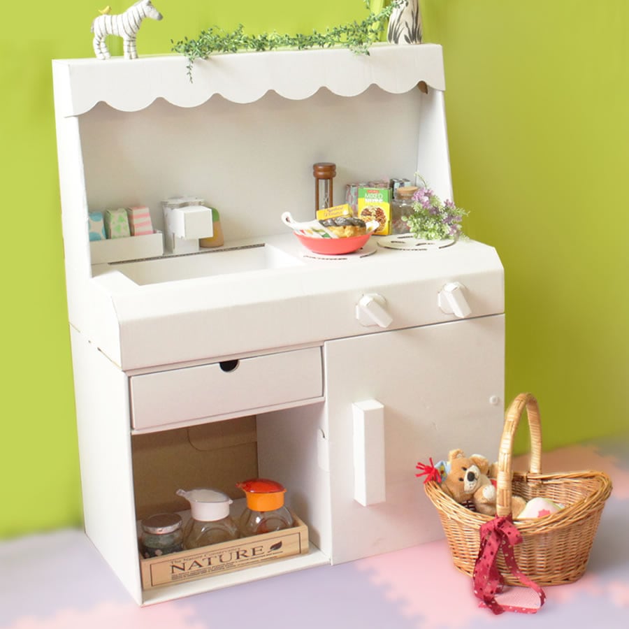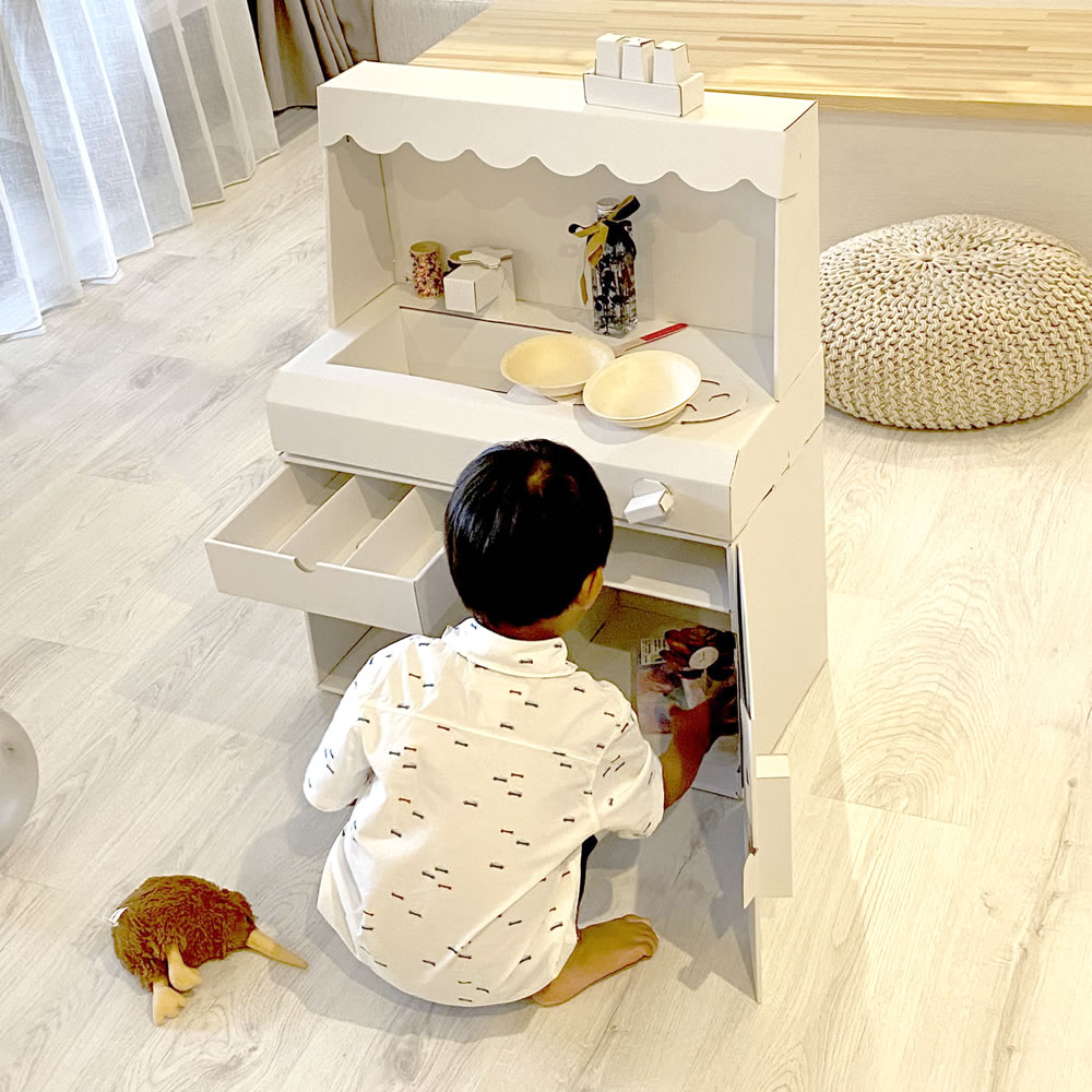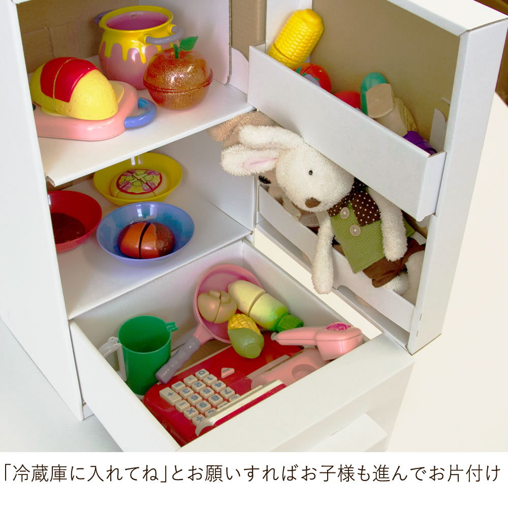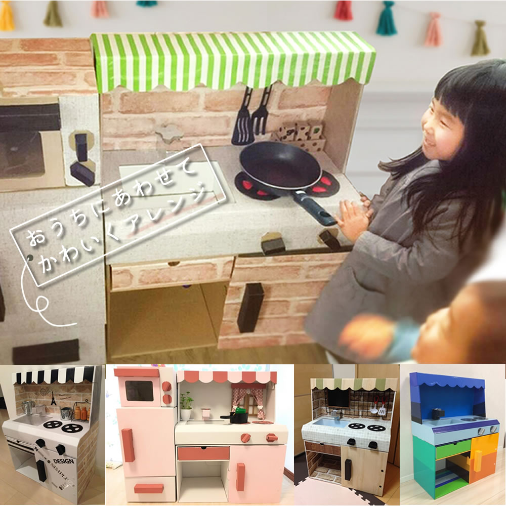 収納スペースも十分あるので遊べるオモチャ箱としてもお使い頂けます。 憧れの木製キッチンもいいけれども安くて安全、持ち運び安さと廃棄も簡単なダンボールままごとキッチンセットを 選んでみてはいかがですか?