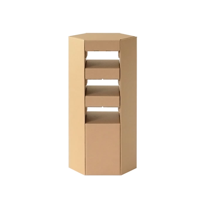 強化ダンボール製、六角柱型のスタンドテーブル。