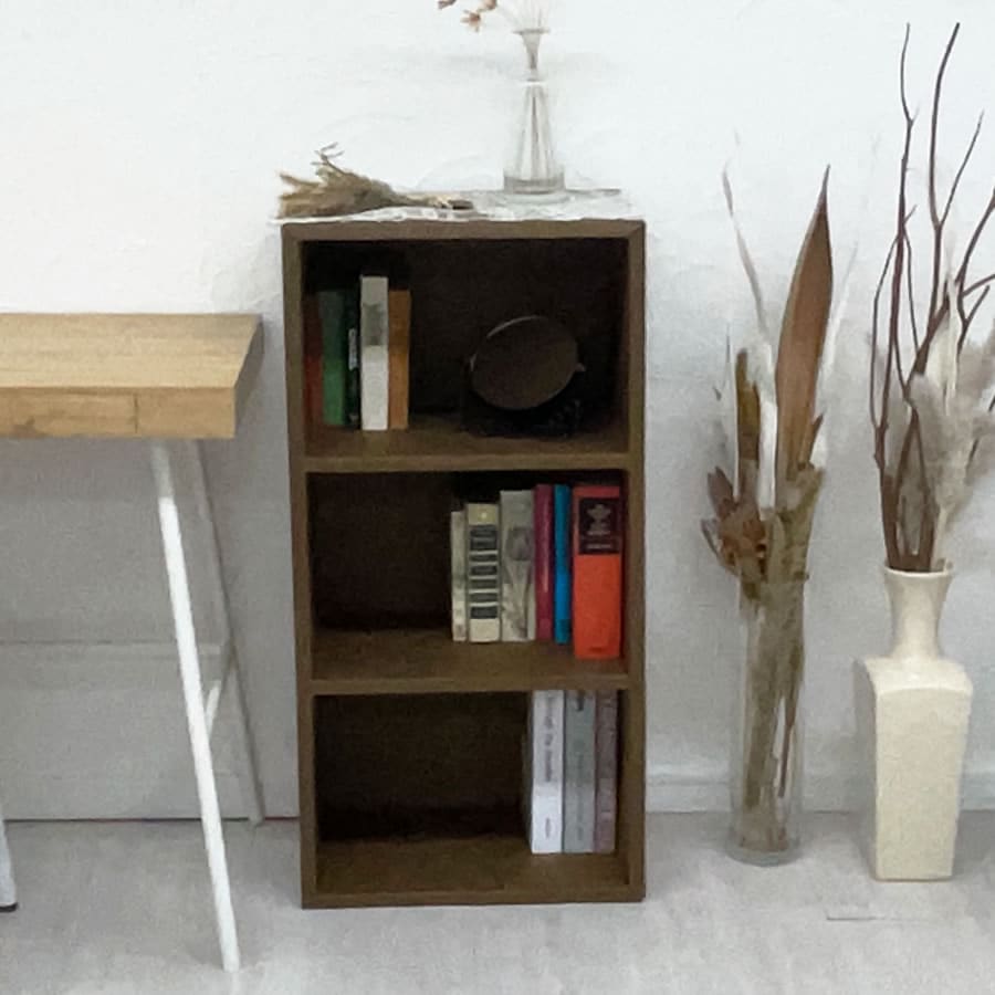 自然な木目模様の3段マルチラックです。「軽い」「組立簡単」「廃棄も簡単」なダンボール家具です。