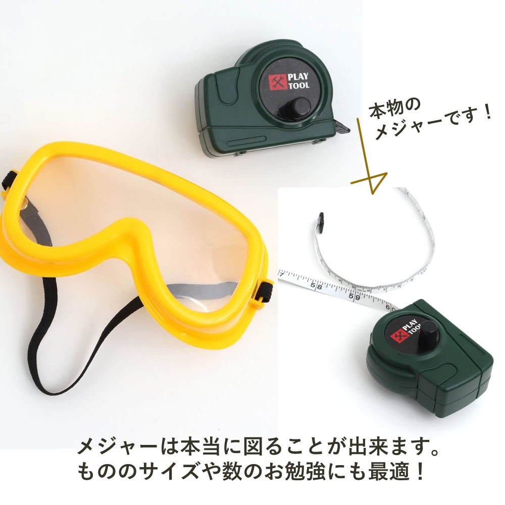 電動ドライバー、カナヅチ、モンキーレンチ、保護ゴーグル、メジャーなど、本格的な11点の工具が再現されています。本物そっくりなので